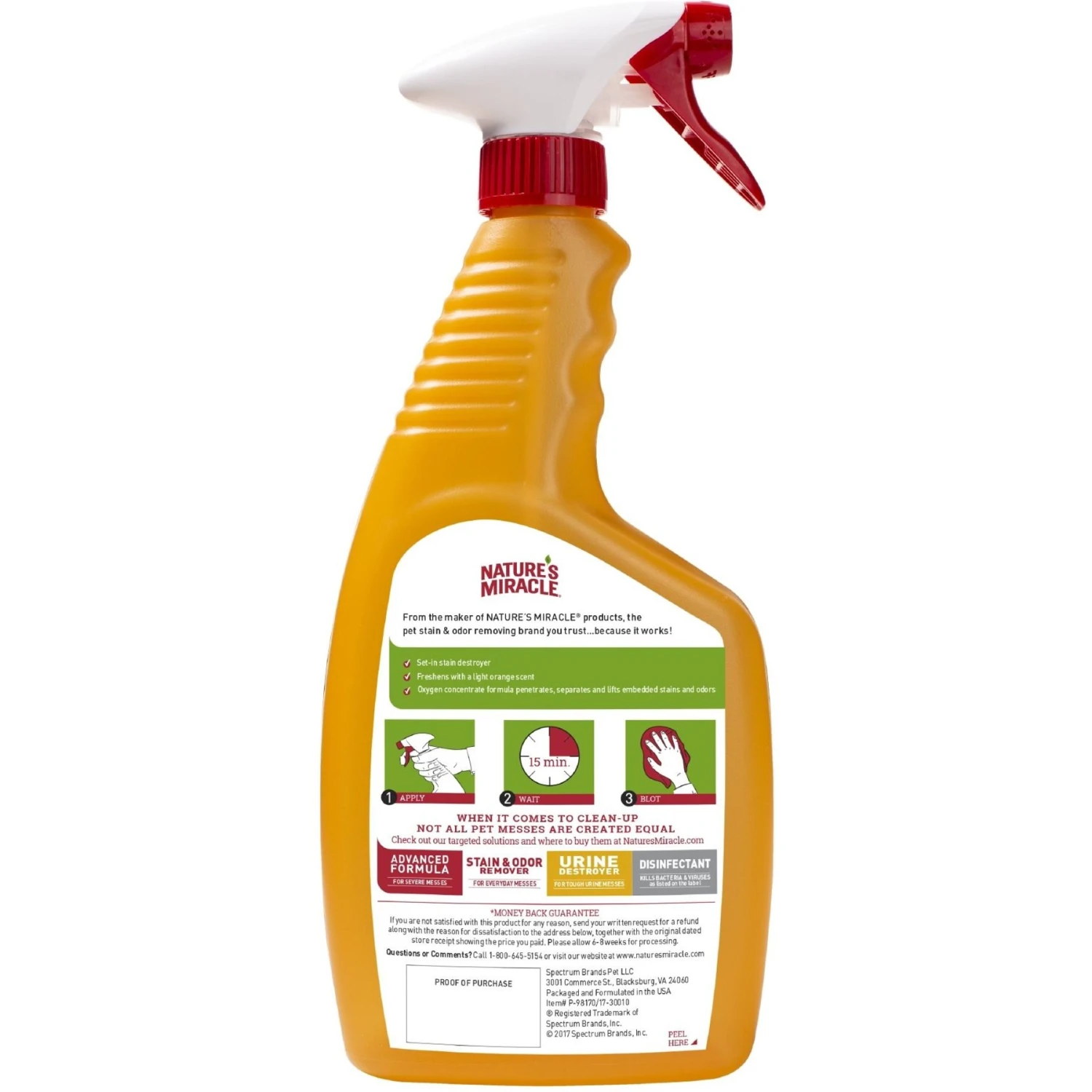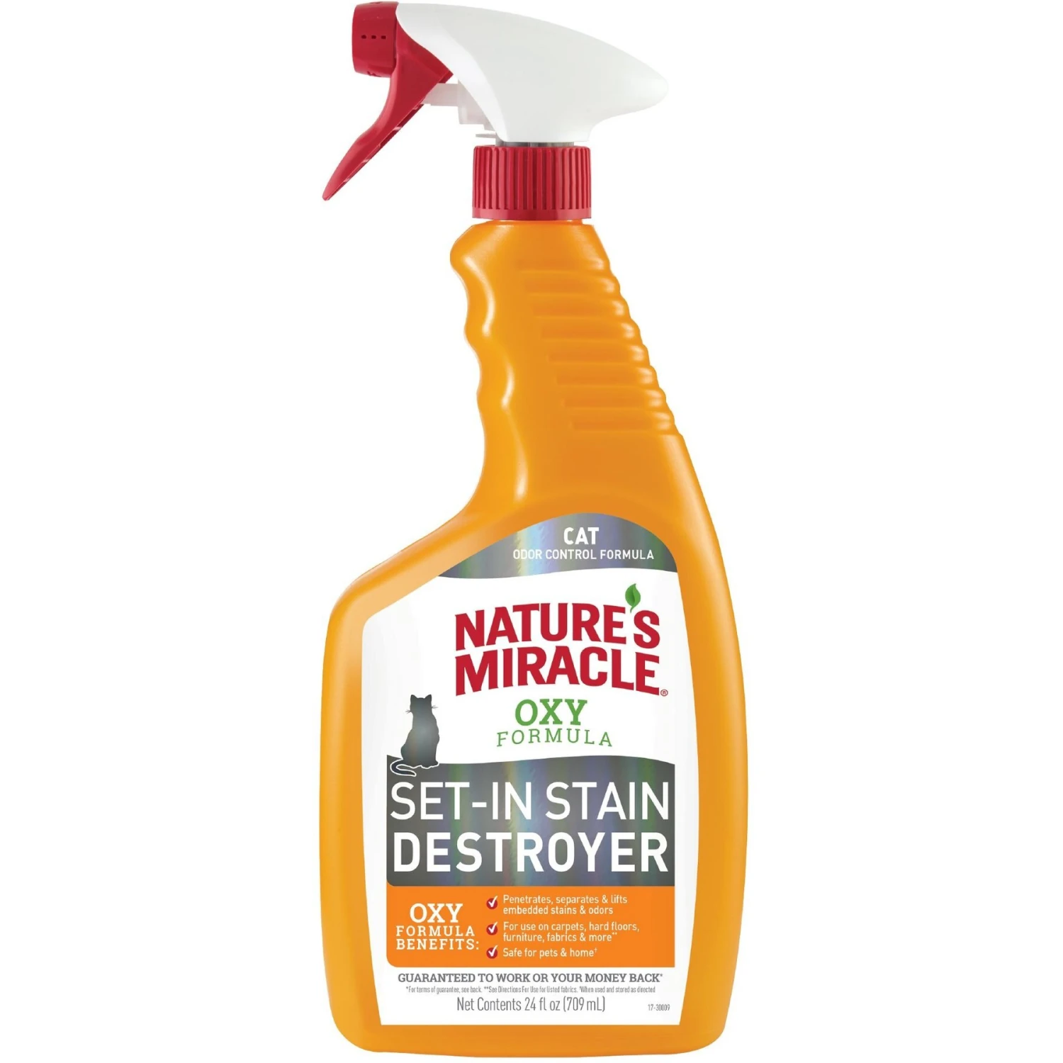 Nature’s Miracle Just For Cats Oxy Cat Stain & Odor Remover, 24-oz bottle—Ever heard the saying “Smells fresh as a cat mess”? We haven’t, either. But just because your furry friend occasionally leaves behind a smelly present, it doesn’t mean you have to suffer. Nature’s Miracle JFC Oxy Cat Stain & Odor Remover is a powerful, oxygenated citrus cleaner that penetrates deep into the toughest stain to remove discoloration and odor. It’s safe to use on fabrics, floors, litter boxes or anywhere around the house that needs to be “de-soiled.”
