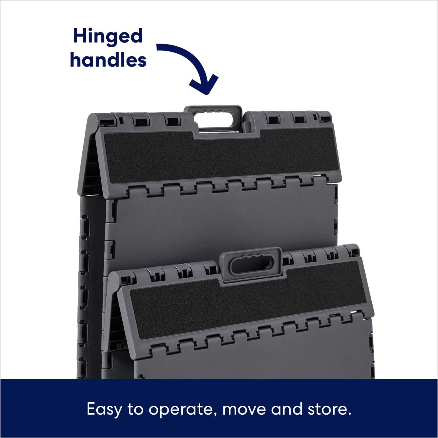 - Easily folds flat for storage in your trunk, under the bed or couch, or against the wall, with hinged handles for quick, grab-and-go access.