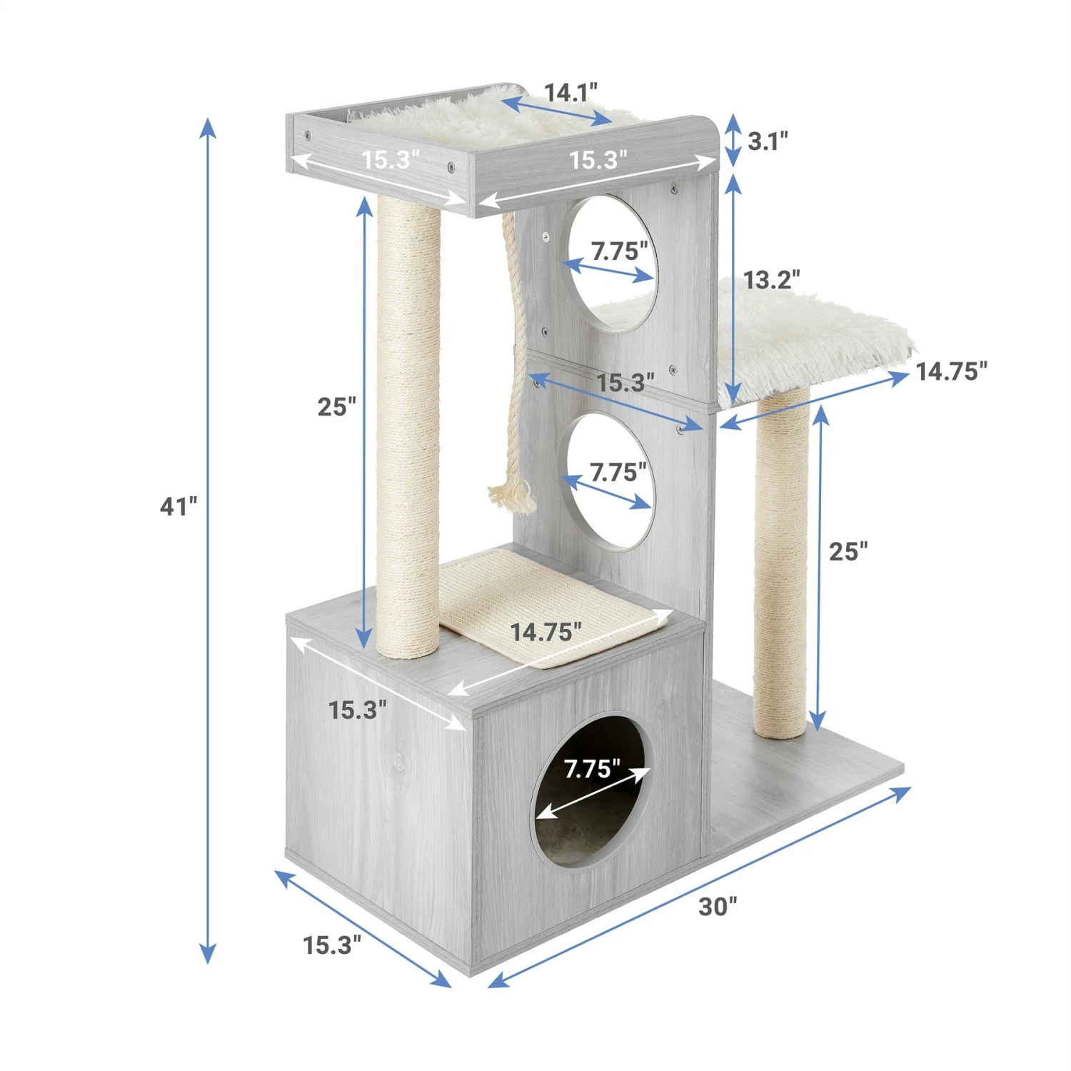 - 41-inch tall cat tree helps satisfy your cat’s core needs at home—play and enrichment, vertical and horizontal scratching, privacy, comfort and elevated spots for napping and lounging.