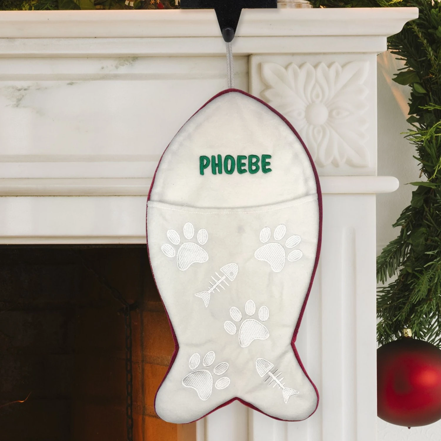 - Fish-shaped stocking features embroidered green lettering on a cream background with fish bone accents and white pawprints.