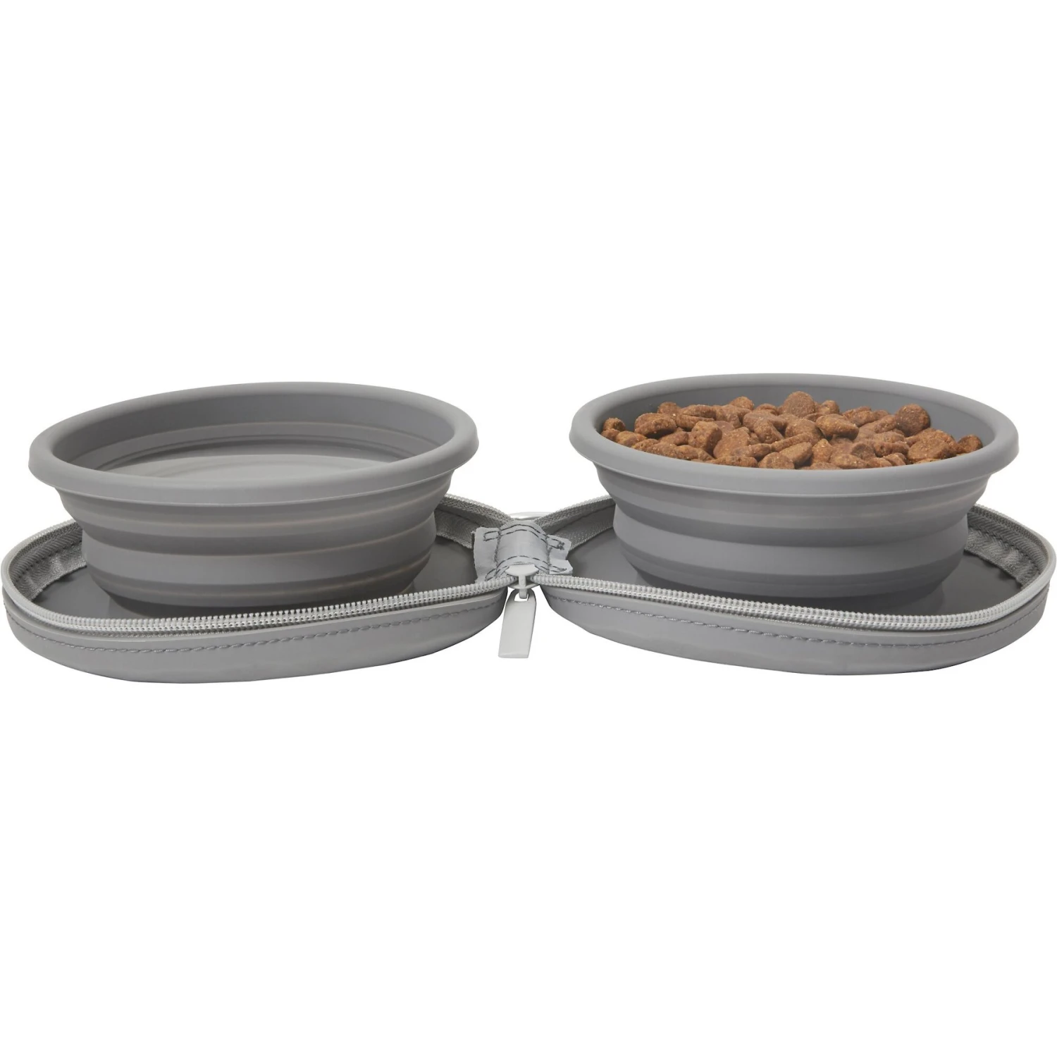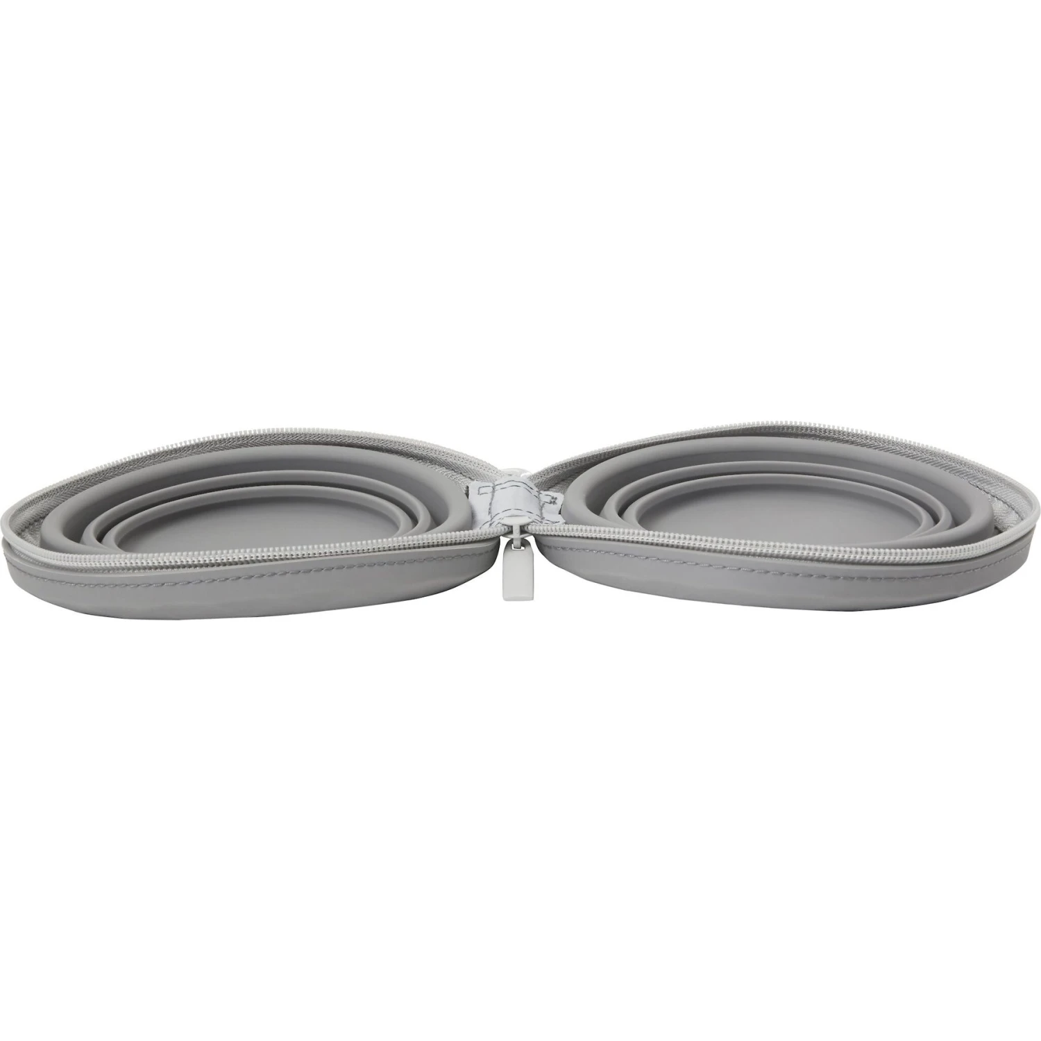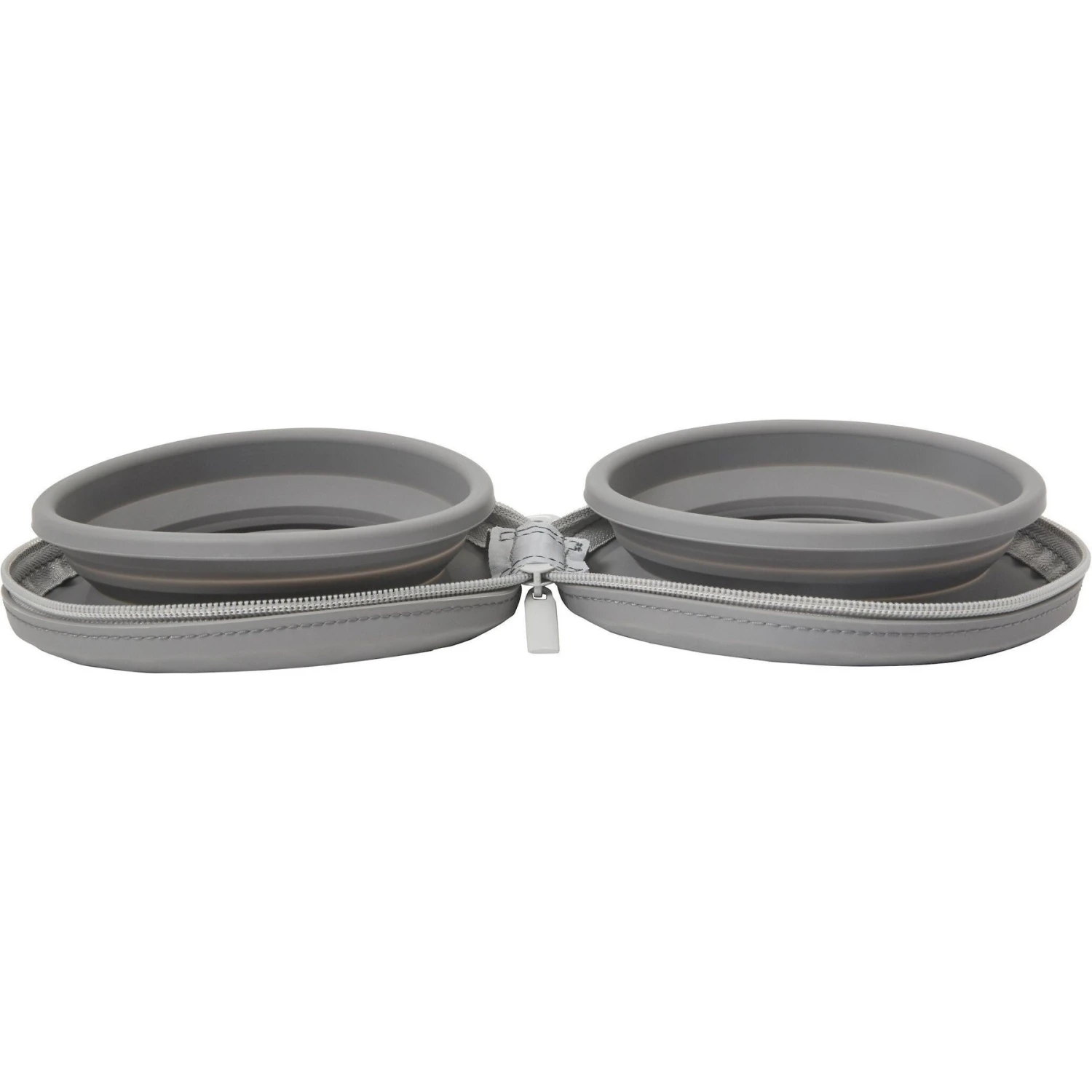 - One set of two collapsible travel bowls that fold up and zipper shut.